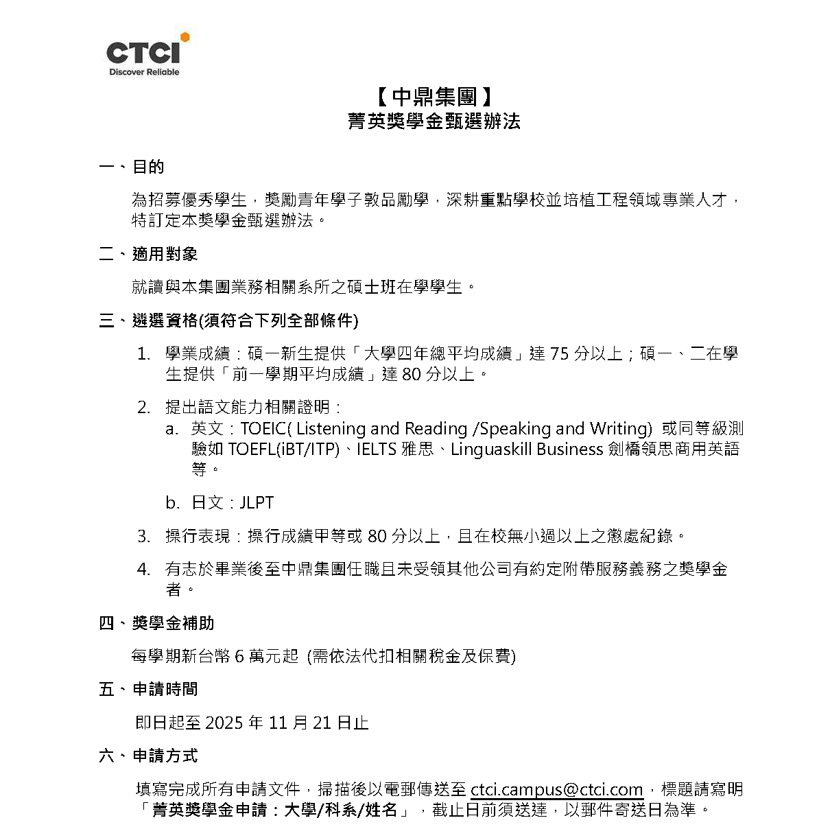 【企業】2025年中鼎集團菁英獎學金 即日起申請至11/21止